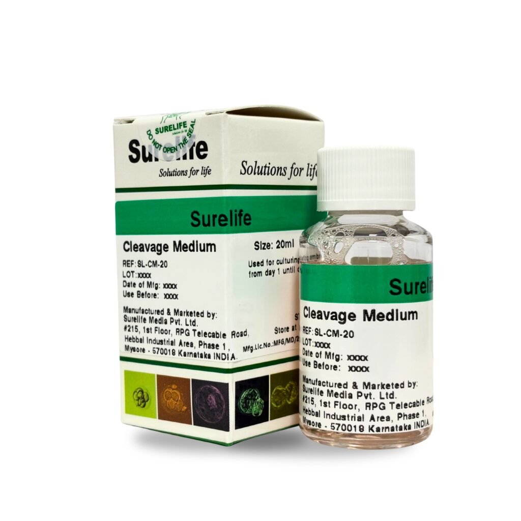Product Code: SL-CM-20 | Volume: 20 ml Surelife Cleavage Medium Overview:Formulated for early embryo development (Day 1–3), with metabolic substrates aligned to the oviductal environment. Low glucose, high pyruvate and lactate for optimal cleavage. Key Benefits: Supports cell division & blastomere integrity.Amino acids for protein synthesis.Antioxidants for oxidative balance.