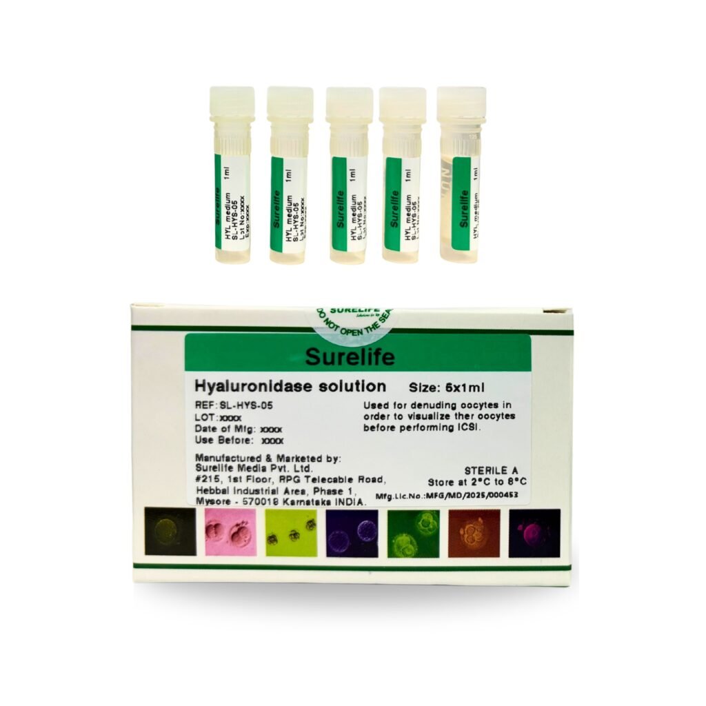 Product Code: SL-HYS-05 | Volume: 5 × 1 ml Surelife Hyaluronidase Solution Overview:Enzymatic solution for rapid and gentle cumulus cell removal before ICSI. HEPES-buffered for ambient air use. Key Benefits: 80 IU/ml hyaluronidase for effective dispersion.Preserves oocyte integrity.No CO₂ environment required.